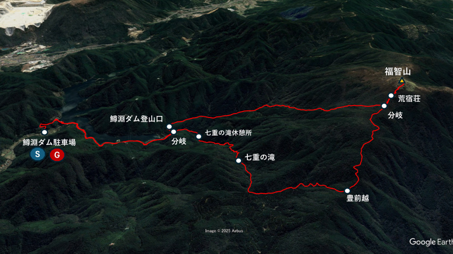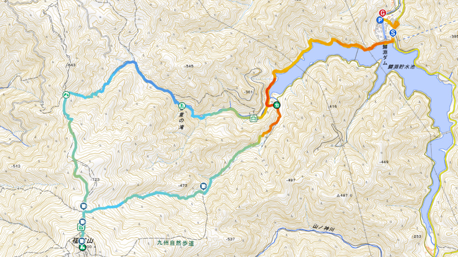 | コース | 駐車場08:40 → 七重の滝休憩所09:28 → 七重の滝10:04 → 豊前越11:13 → 荒宿荘12:04 → 福地山12:49 → 荒宿荘13:16 → 鱒淵ダム登山口14:44 → 駐車場15:25 |