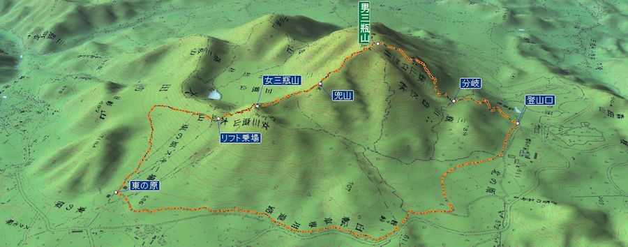 → 女三瓶山13:30 → リフト乗場13:50 → 東の原14:20 → 登山口15:30 |