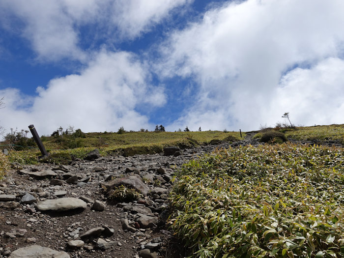 ![]() 急登をのぼりきり視界が開け根子岳を見る。。 |
