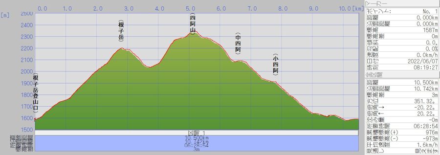 | コース | 根子岳登山口08:19 → 根子岳10:00 → 四阿山11:55(昼食・撮影) → 中四阿13:16 → 小四阿14:00 → 四阿山登山口14:40 → 根子岳登山口14:48 |